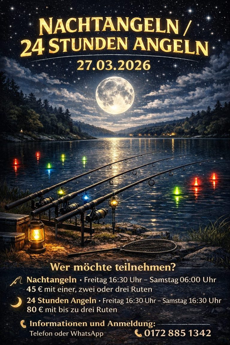Alle Angelfreunde sind herzlich eingeladen, eine besondere Zeit am Wasser zu erleben – unter Mond und Sternen, mit leuchtenden Posen und einer einzigartigen Atmosphäre.